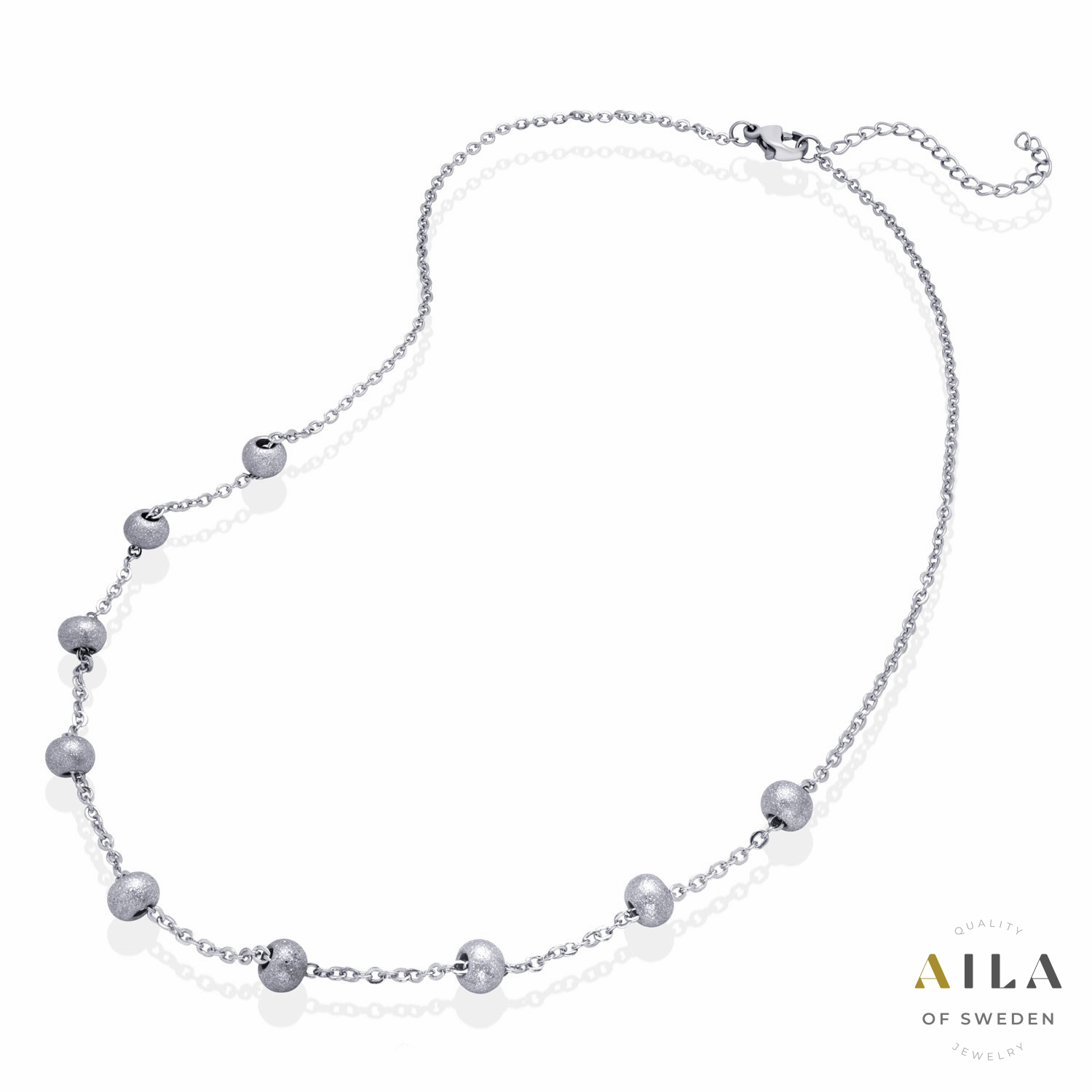 Silverfärgat halsband med silverfärgade pärldetaljer. Kedja 42 + 5 cm. Hängets storlek 6 mm.