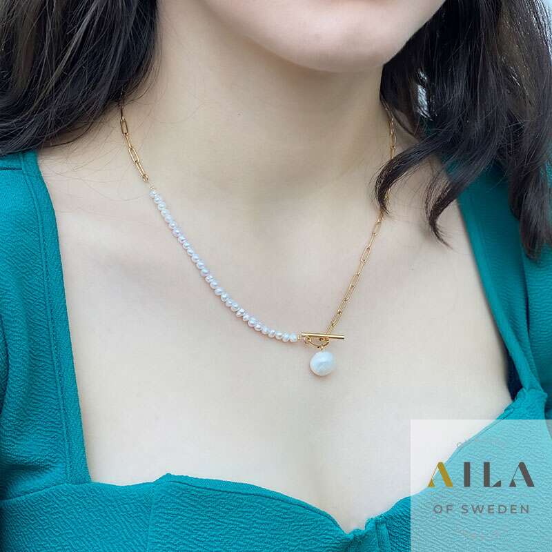Ett modernt länkhalsband med vackra färskvattenspärlor i stainless steel. Knäpps i fram.